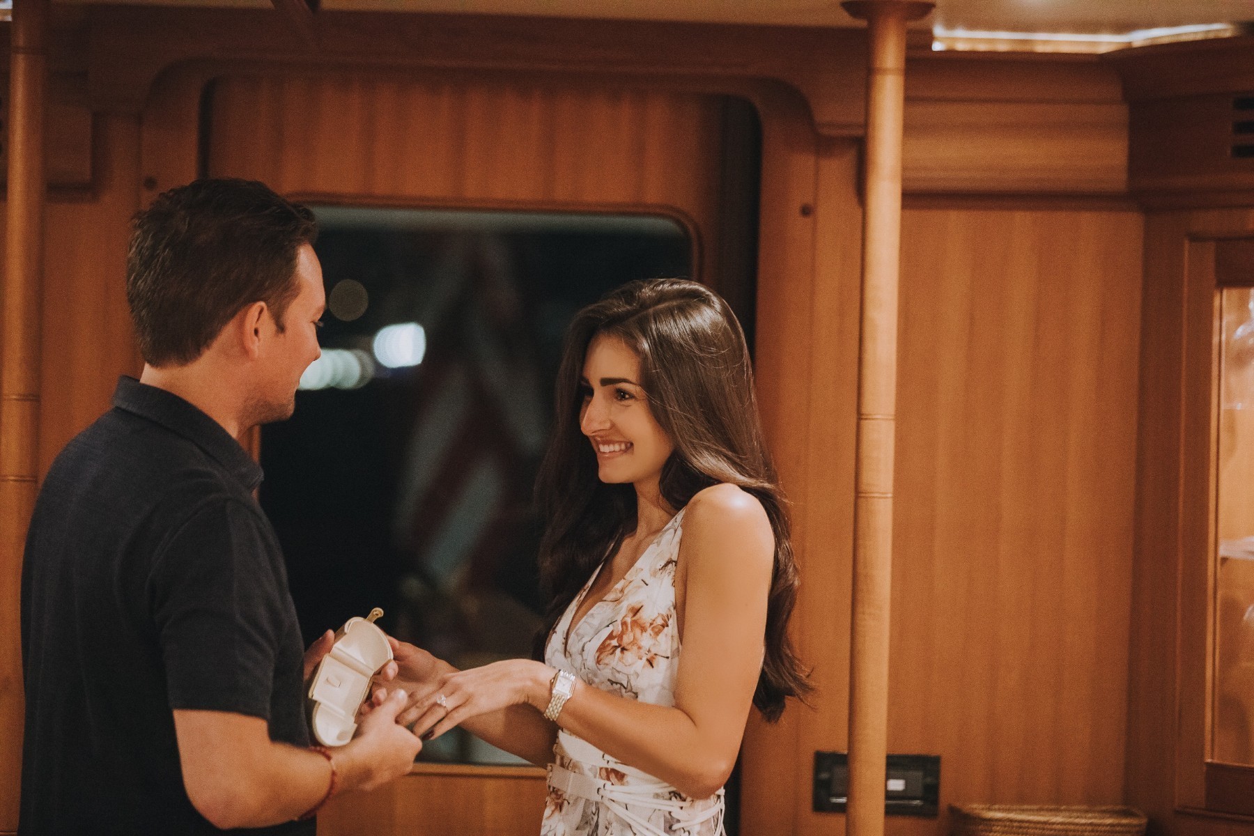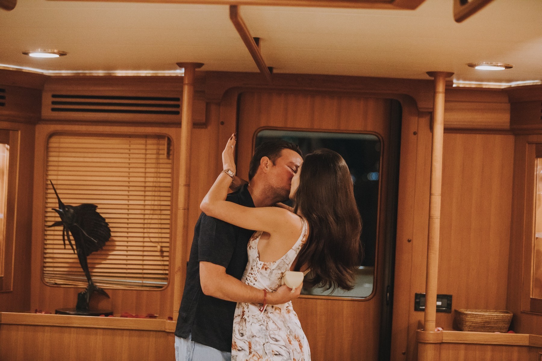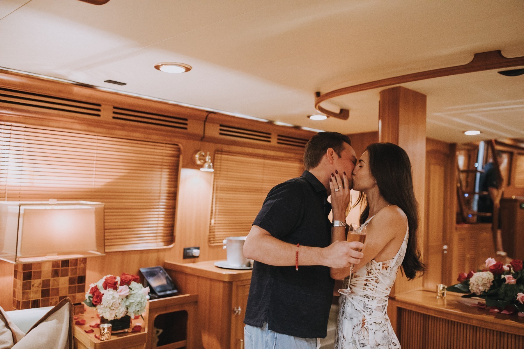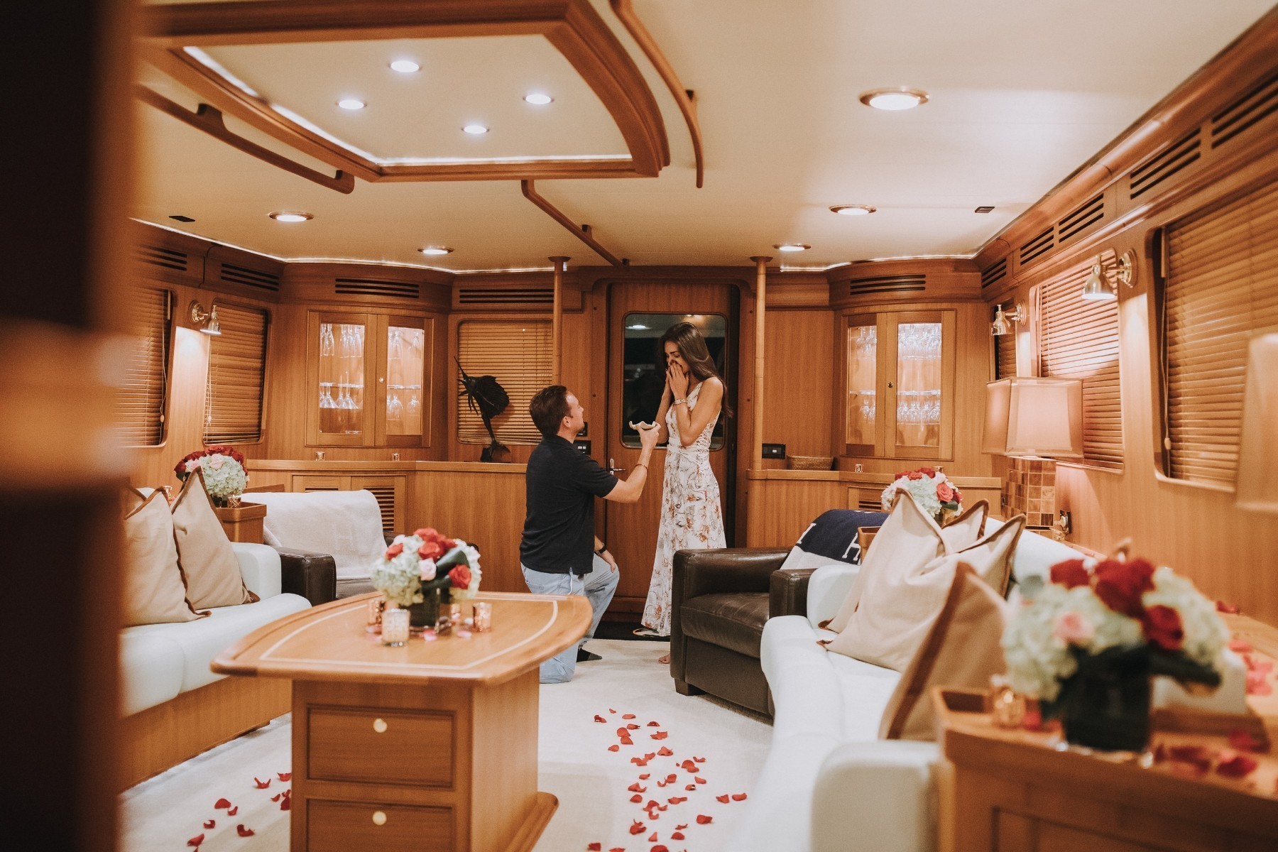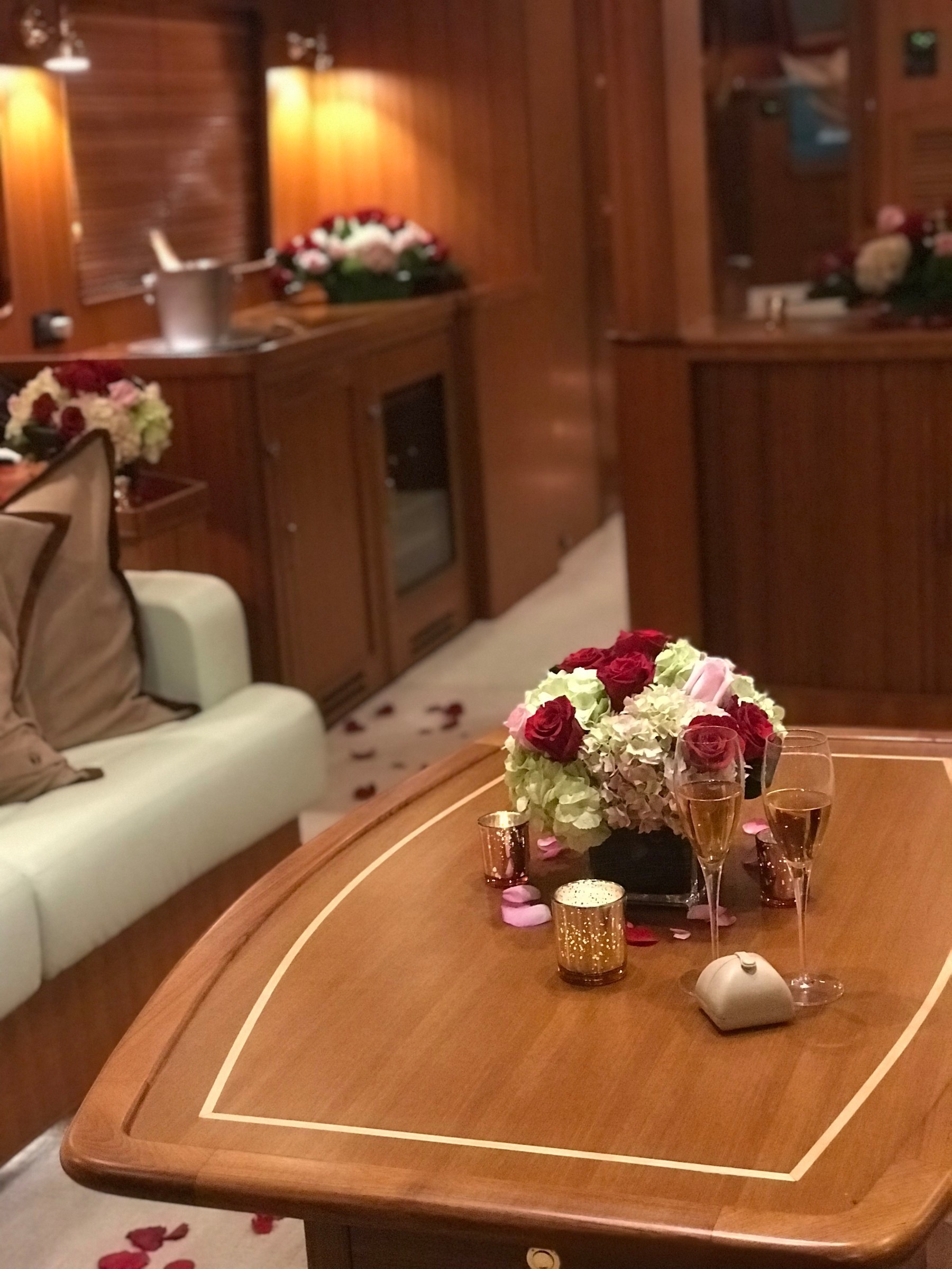 John proposed on his father's boat, where we first met and had spent so many wonderful days and nights together. He arranged a romantic dinner on a random Wednesday night in hopes of genuinely surprising me, which he successfully did. We boarded the boat and upon opening the door revealed the interior covered in red rose petals, dozens of red roses, and flower arrangements. We both were shaking when John reached into his pocket, got on one knee, and pulled out the most stunning ring I have EVER seen. A moment later, he asked me if I would “Be his Bubby forever?”. After a few seconds in a state of surprise, amazement, and overwhelming gratitude, I said “Yes!”. We embraced and celebrated this moment. Then we popped a bottle of champagne, had a private dinner catered from one of our local favorite restaurants, Papa’s Raw Bar, while cruising the intercostal. John hired a photographer to capture the entire proposal. It was a magical evening.