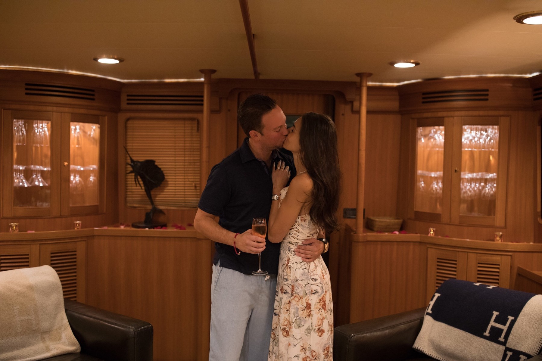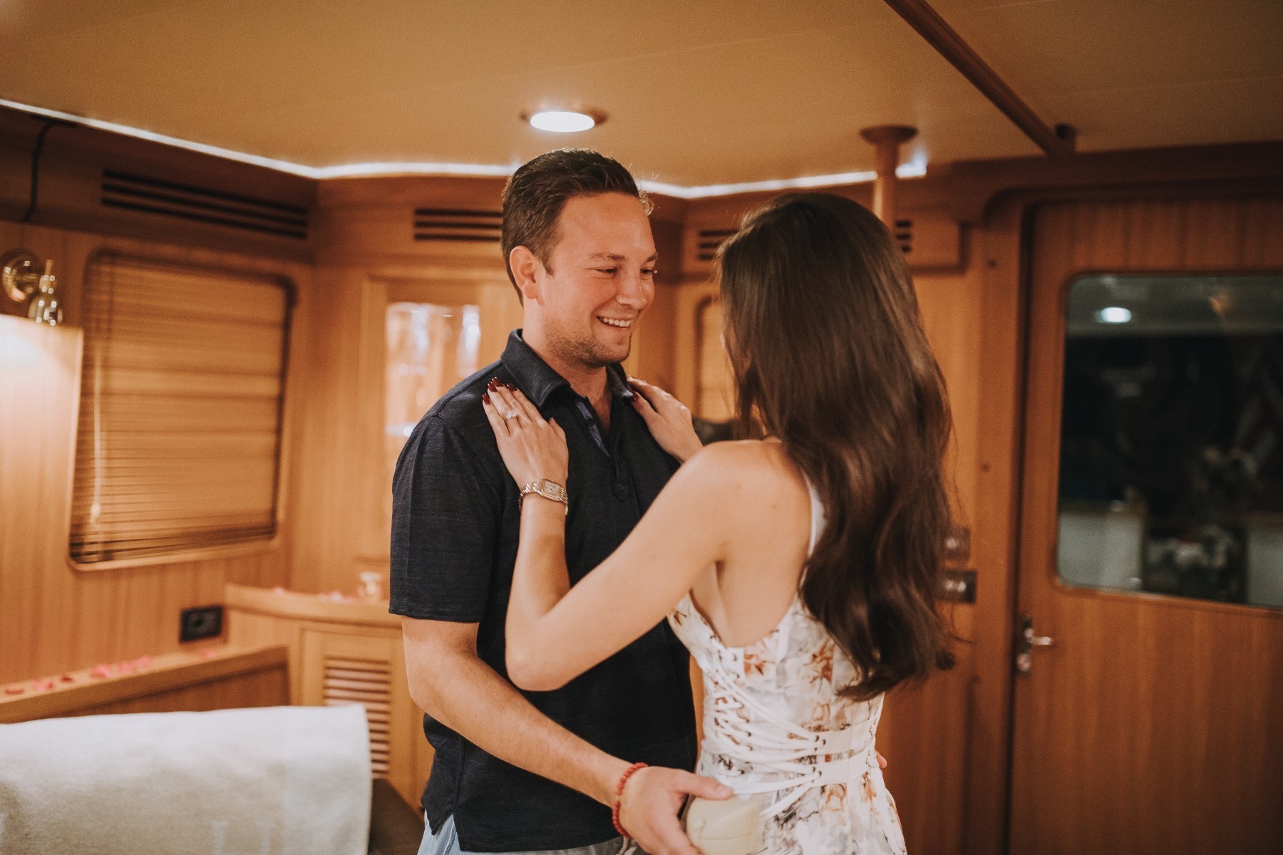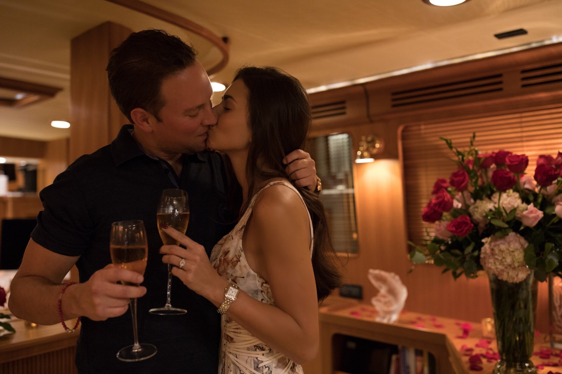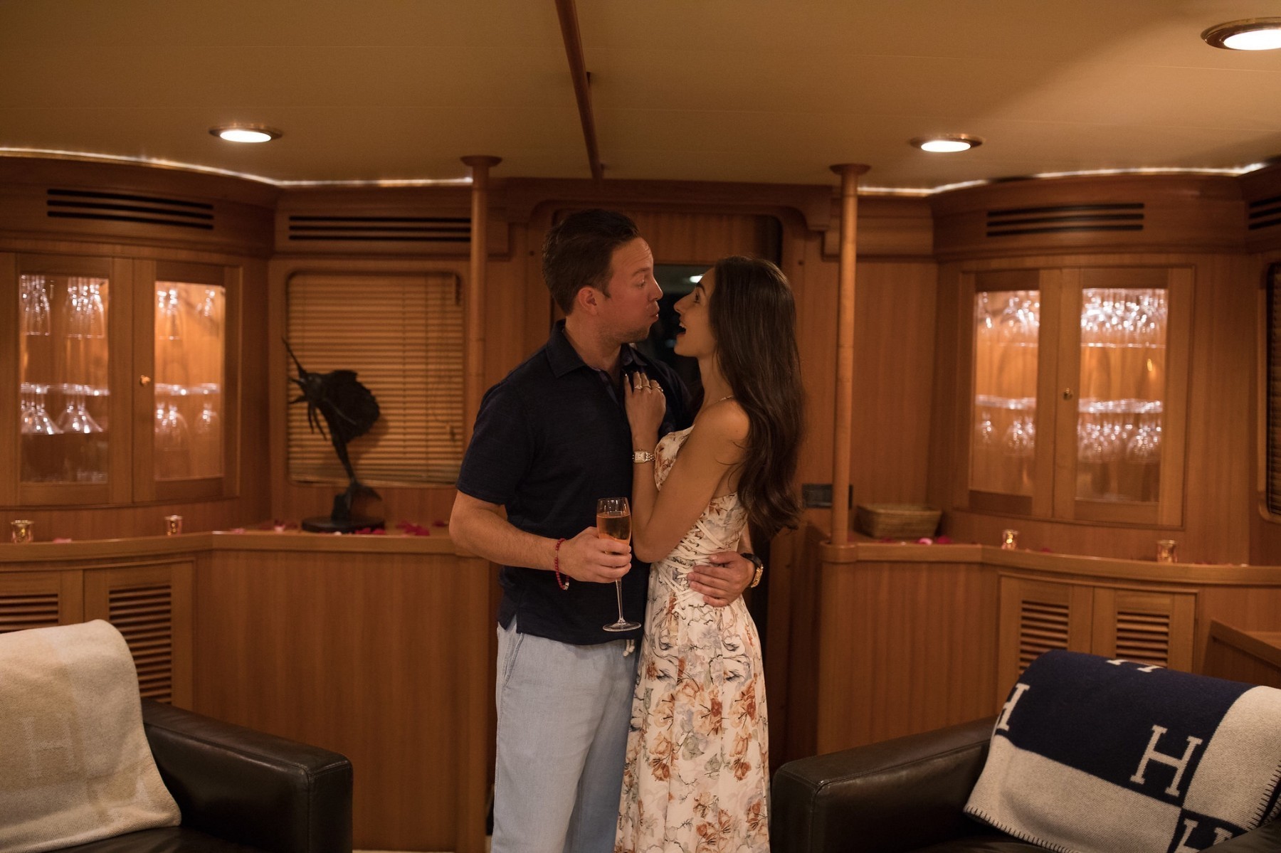 John proposed on his father's boat, where we first met and had spent so many wonderful days and nights together. He arranged a romantic dinner on a random Wednesday night in hopes of genuinely surprising me, which he successfully did. We boarded the boat and upon opening the door revealed the interior covered in red rose petals, dozens of red roses, and flower arrangements. We both were shaking when John reached into his pocket, got on one knee, and pulled out the most stunning ring I have EVER seen. A moment later, he asked me if I would “Be his Bubby forever?”. After a few seconds in a state of surprise, amazement, and overwhelming gratitude, I said “Yes!”. We embraced and celebrated this moment. Then we popped a bottle of champagne, had a private dinner catered from one of our local favorite restaurants, Papa’s Raw Bar, while cruising the intercostal. John hired a photographer to capture the entire proposal. It was a magical evening.