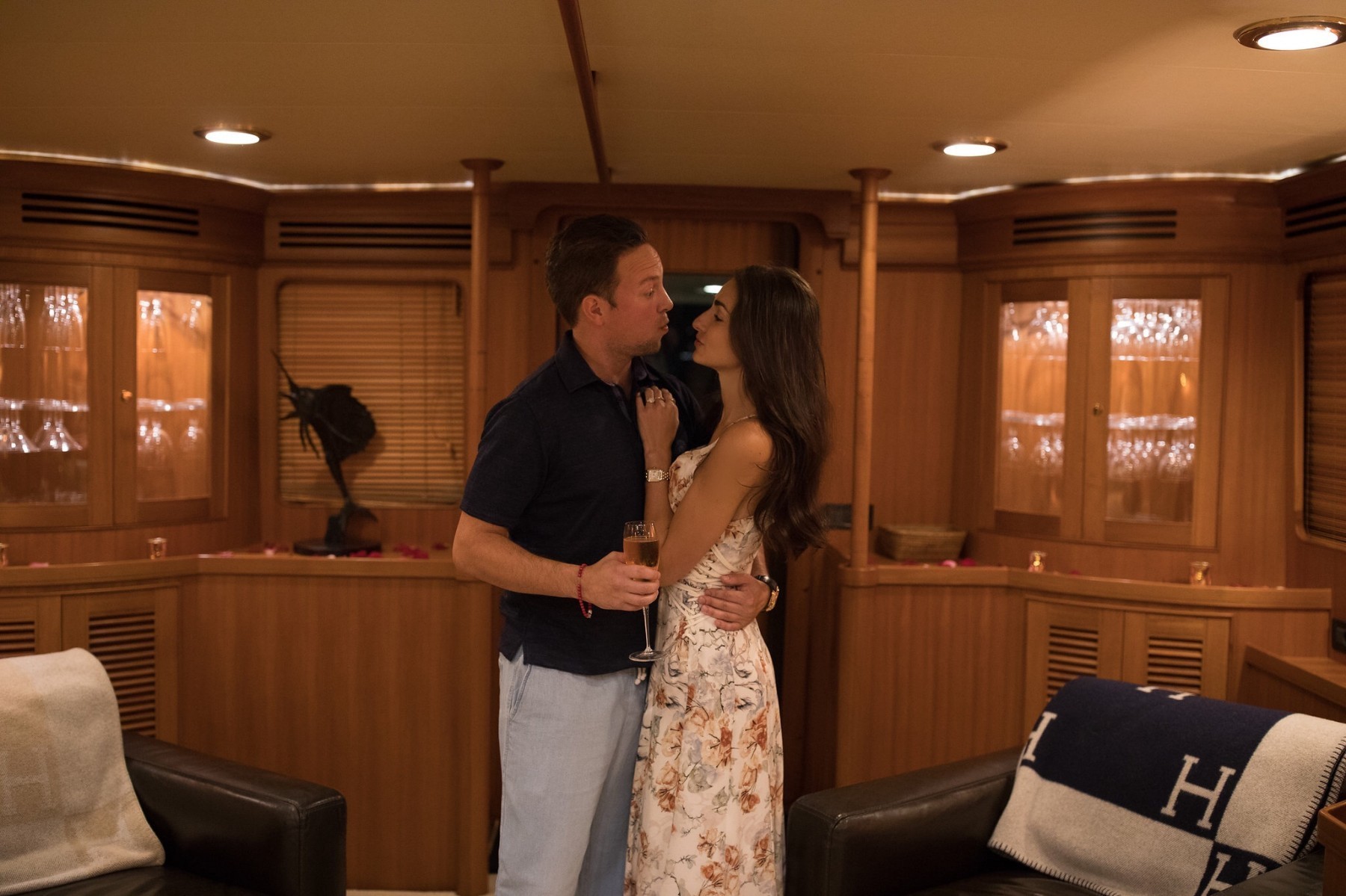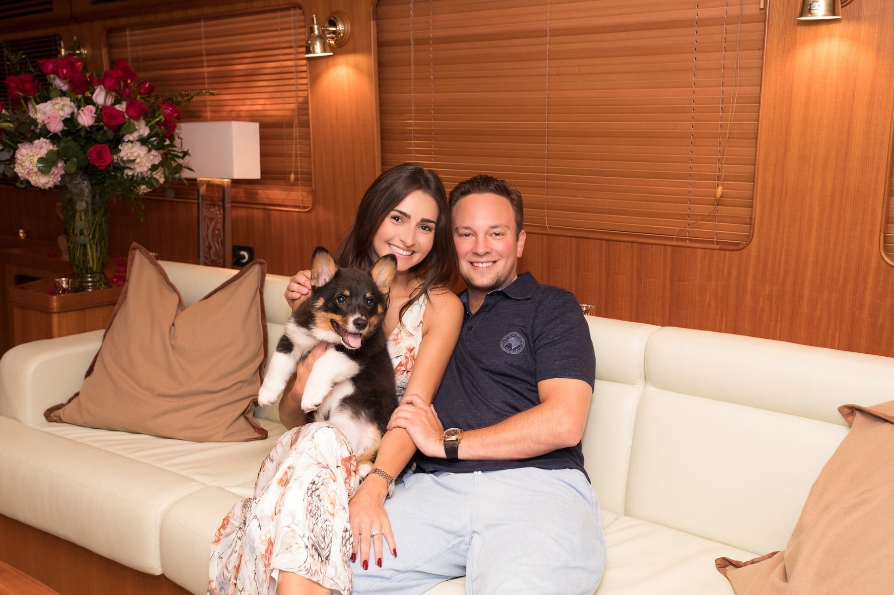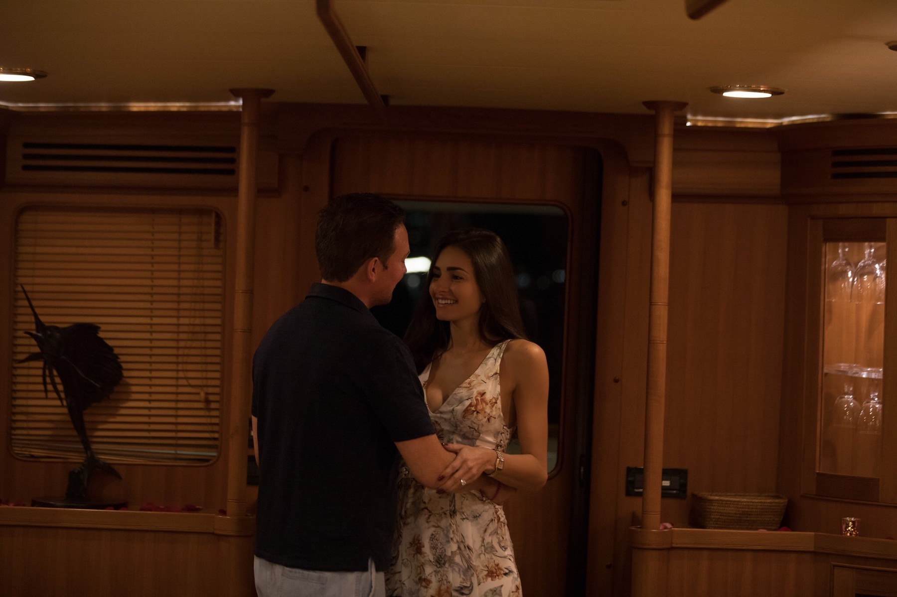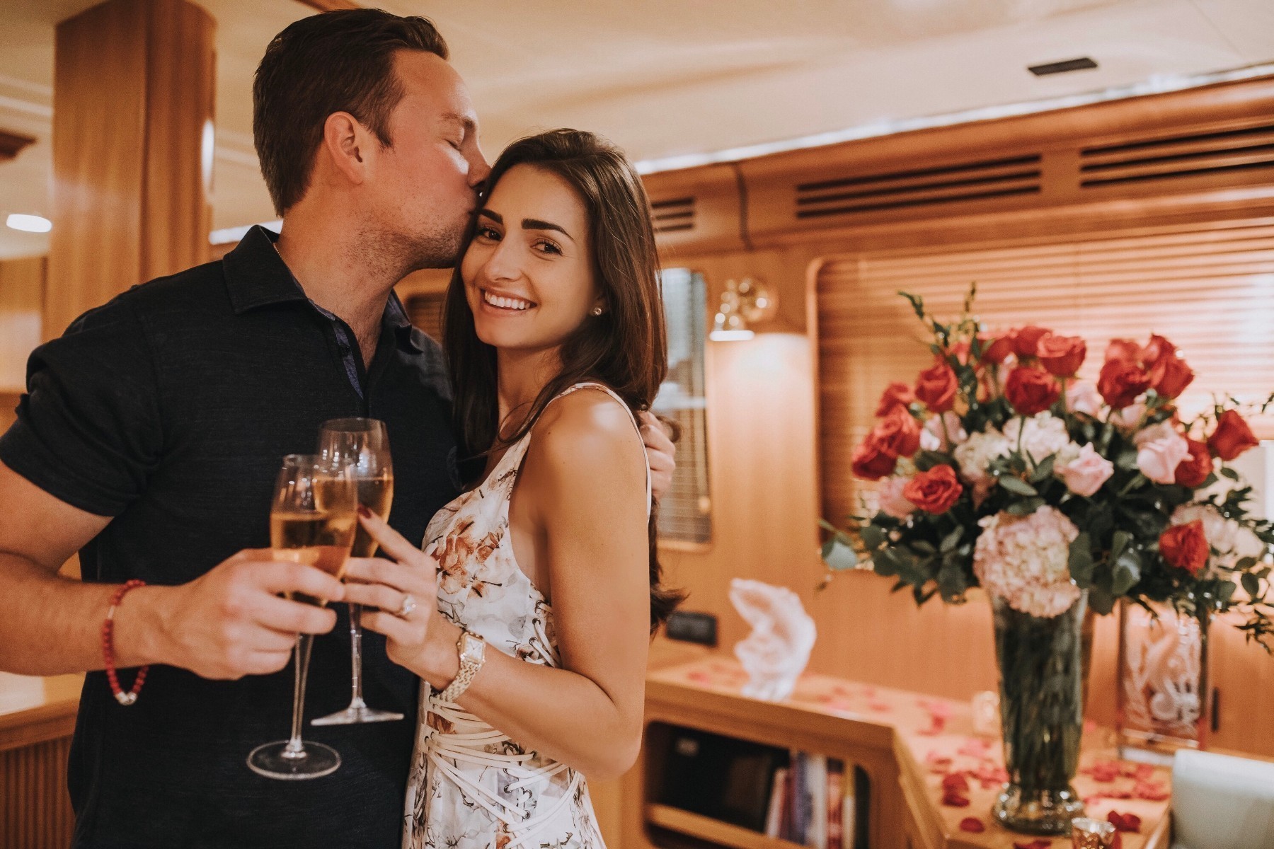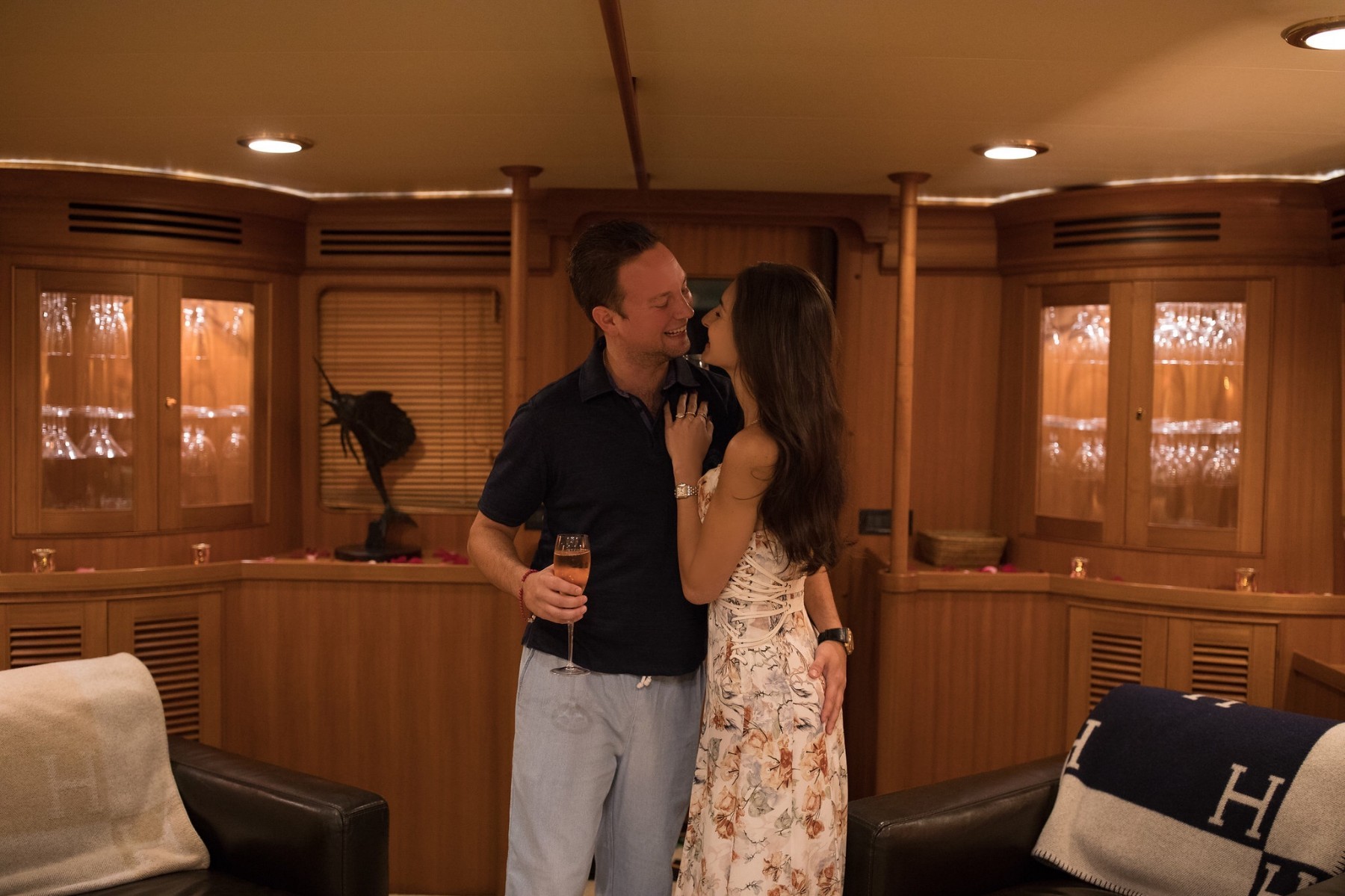 John proposed on his father's boat, where we first met and had spent so many wonderful days and nights together. He arranged a romantic dinner on a random Wednesday night in hopes of genuinely surprising me, which he successfully did. We boarded the boat and upon opening the door revealed the interior covered in red rose petals, dozens of red roses, and flower arrangements. We both were shaking when John reached into his pocket, got on one knee, and pulled out the most stunning ring I have EVER seen. A moment later, he asked me if I would “Be his Bubby forever?”. After a few seconds in a state of surprise, amazement, and overwhelming gratitude, I said “Yes!”. We embraced and celebrated this moment. Then we popped a bottle of champagne, had a private dinner catered from one of our local favorite restaurants, Papa’s Raw Bar, while cruising the intercostal. John hired a photographer to capture the entire proposal. It was a magical evening.