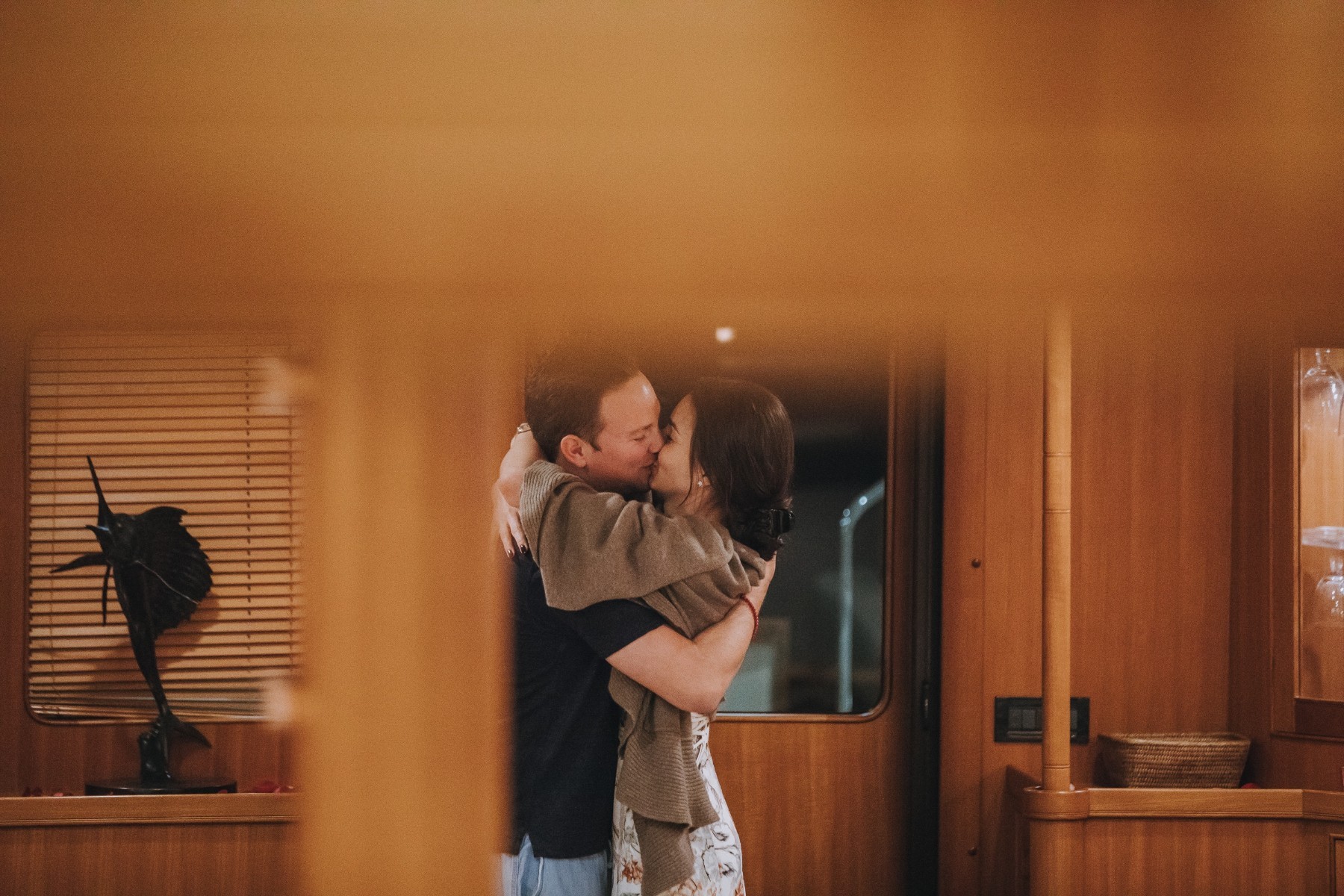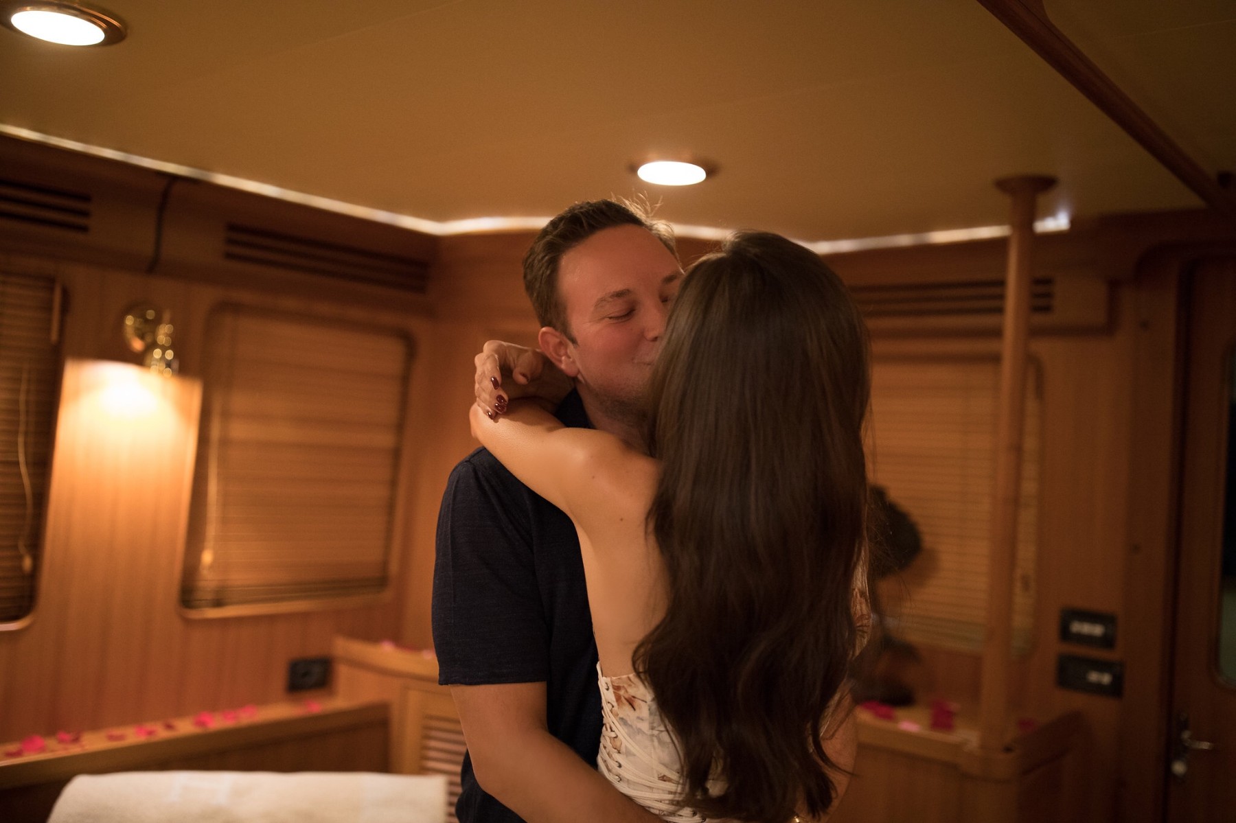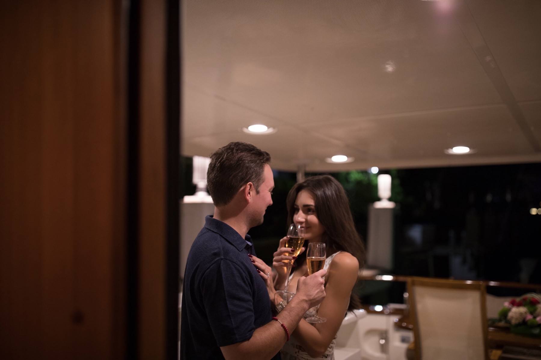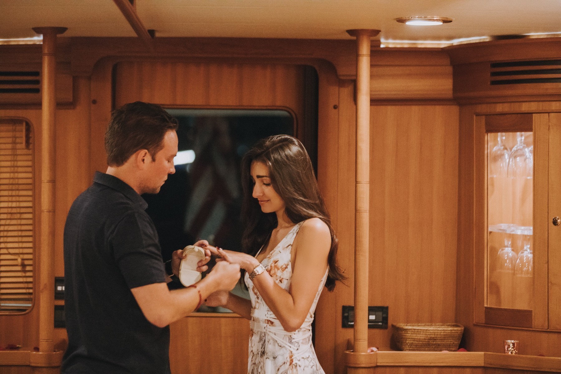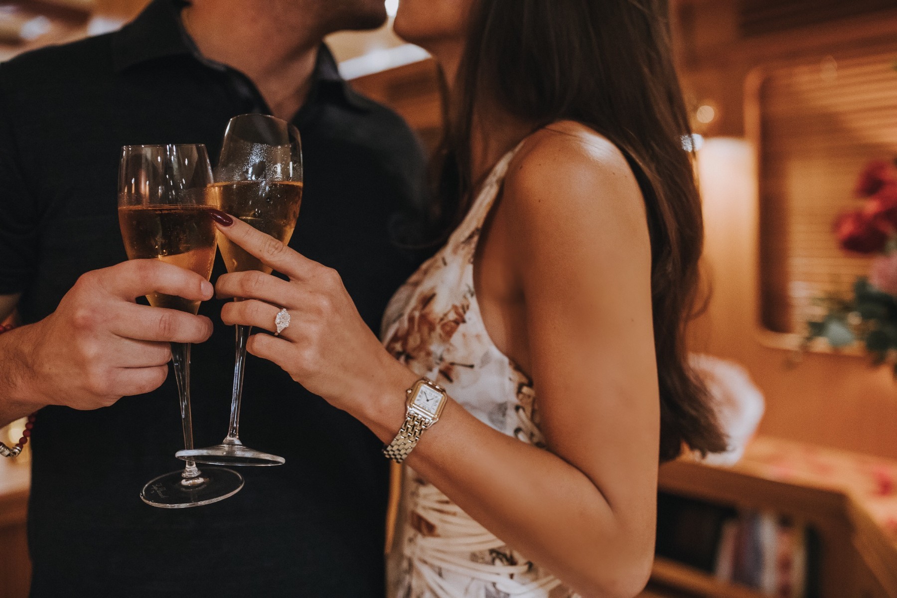 John proposed on his father's boat, where we first met and had spent so many wonderful days and nights together. He arranged a romantic dinner on a random Wednesday night in hopes of genuinely surprising me, which he successfully did. We boarded the boat and upon opening the door revealed the interior covered in red rose petals, dozens of red roses, and flower arrangements. We both were shaking when John reached into his pocket, got on one knee, and pulled out the most stunning ring I have EVER seen. A moment later, he asked me if I would “Be his Bubby forever?”. After a few seconds in a state of surprise, amazement, and overwhelming gratitude, I said “Yes!”. We embraced and celebrated this moment. Then we popped a bottle of champagne, had a private dinner catered from one of our local favorite restaurants, Papa’s Raw Bar, while cruising the intercostal. John hired a photographer to capture the entire proposal. It was a magical evening.